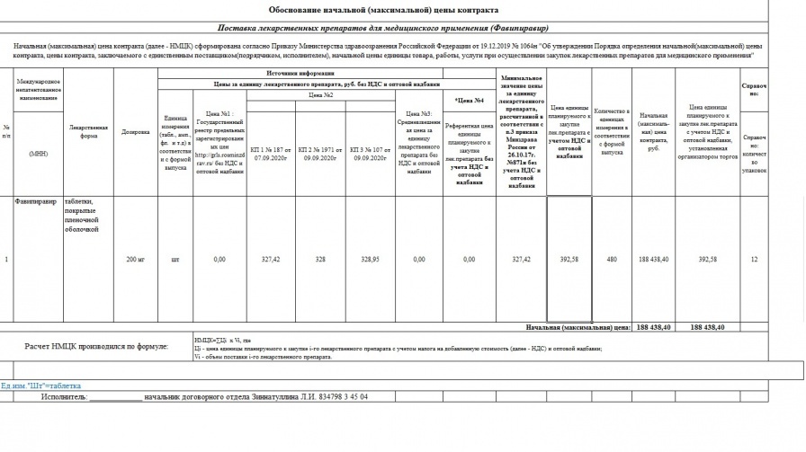 Это сметная документация госзакупки препарата «Фавипиравир».