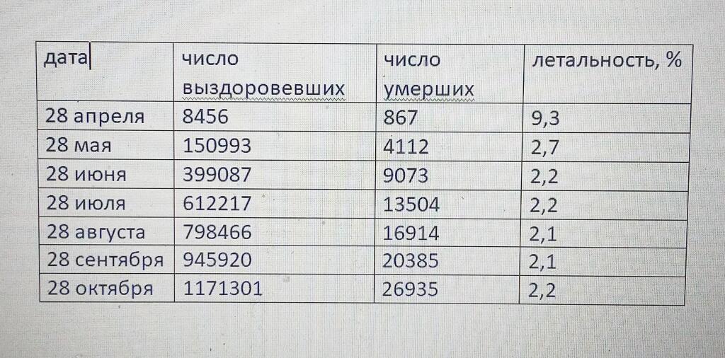 Вирусолог Константин Чумаков 26 октября дал интервью радио "Эхо Москвы", и сообщил, что летальность COVID-19 якобы снижается, уже до 1%. Давайте проверим, так ли это, на примере России. Рассчитаем летальность COVID-19 для России по состоянию на 28 число каждого месяца, начиная с апреля, по октябрь. Хотя много раз высказывались сомнения в достоверности официальных цифр статистики по COVID-19, но других цифр у нас нет. Наконец, и упомянутый выше учёный также, несомненно, должен был исходить из официальных цифр. Числа выздоровевших и умерших от начала эпидемии до конкретной даты взяты со страницы https://www.kommersant.ru/doc/4314405?from=doc_widget . Летальность, как известно, это доля умерших в результате заболевания от общего числа завершившихся случаев заболевания, выраженная в процентах. К завершившимся случаям заболевания относятся случаи смерти и выздоровления. Вычисляется летальность по формуле: Л=100%*У/ (В+У), - где У - число умерших, В - число выздоровевших. Приведём получившуюся таблицу: