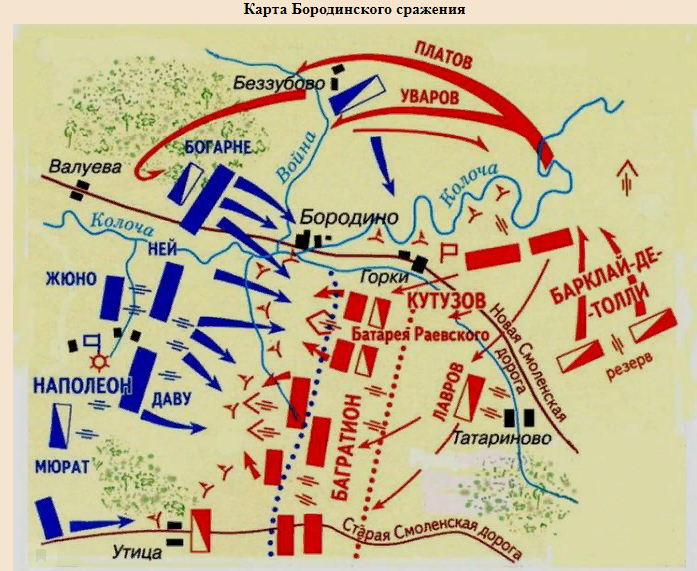 24 августа 1812 года за 2 дня до решающей битвы, состоялась битва за шевардинский редут. Этим редутом командовал генерал Горчаков, в подчинении которого находилось 11 тысяч человек. Южнее, с корпусом в 6 тысяч человек, располагался генерал Карпов, который прикрывал старую Смоленскую дорогу. Наполеон начальной целью своего удара наметил шевардинский редут, поскольку он был максимально отдален от основной группировки русских войск. По замыслу французского императора Шевардино следовало окружить, тем самым выведя армию генерала Горчакова из сражения. Для этого французская армия в атаке составила три колонны: