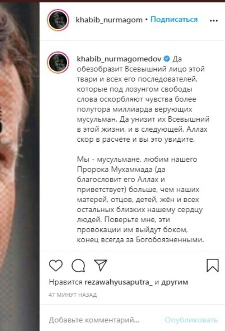 Нет конечно. Но словестно бы максимально жёстко отреагировала. Не я дыхание жизни дала человеку и не мне отнимать. Я бы пальцем не тронула никого. Наказание это пререгатива Всевышнего. А вот мнение своё я имею полное право высказать. Просто есть вещи, которые ну нельзя трогать, ни "языком" ни чем. Это все должны понимать и знать. Это же не просто Богохульство, а провокация, неуважение к огромному колличеству людей. Повторюсь, я не мусульманка, я просто верю во Всевышнего по своему, он у меня в сердце. А бабушка у меня православная. И я представляю насколько ей бы было плохо и больно, если бы кто то рисовал карикатуры на Богоматерь или Христа. Для неё это свято. Как и для многих. Да, Хабиб жёстко выразился, но его спровоцировали, задели за святое, живое. И не только его, а всех его родных и близких. А он как горячий Кавказский мужчина, на эмоциях дал ответку жёстко.
