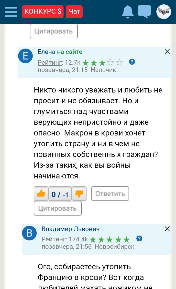 Я никогда не поддамся на ваши провокации, так что не тужьтесь зря. Никто и никогда, в здравом уме, не оправдает любое насилие, тем более отрезание голов, чай, не в средневековье живем. А то, что Макрон открыл провокативный кровавый шлюз, говорит о том, что он, по меньшей мере, сумасброд, а в большей части, провокатор. А теперь покажите мне, где и когда у меня была иная точка зрения?