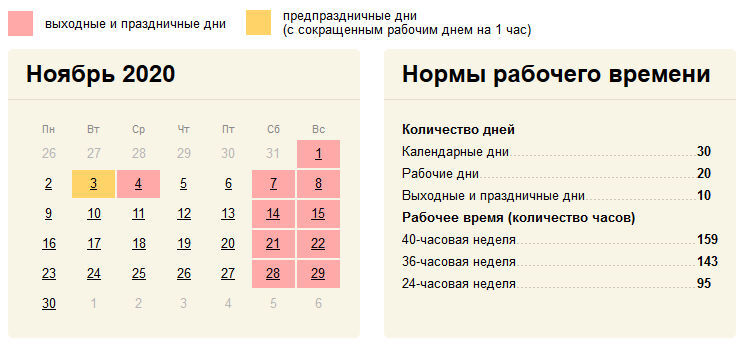 В ноябре 2020 года из тридцати календарных при пятидневной рабочей неделе нас ждут 20 рабочих дней. Традиционно в этом месяце четвертого числа празднуется День народного единства, он выпадает на среду и будет нерабочим. Таким образом, всего выходных в ноябре — десять.