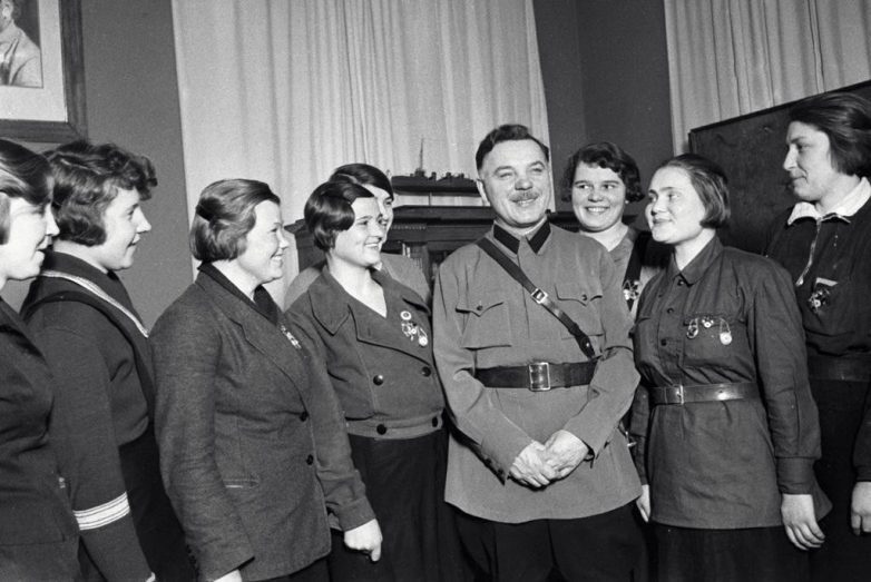Нарком обороны СССР К. Е. Ворошилов встречается с комсомолками, награждёнными почётным знаком «Ворошиловский стрелок». 1 ноября 1935 года.