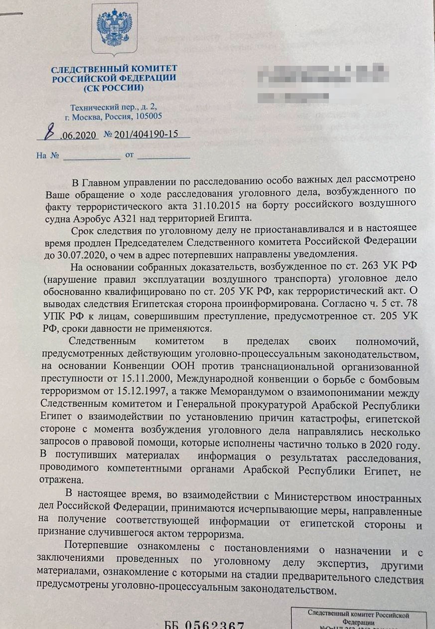 Но, председатель Следственного комитета России А. Бастрыкин не приостанавливает это дело и регулярно его продлевает, однако к большому сожалению толку от этого пока нет, поскольку его подчиненные расписываются в бессилии, кивая на несговорчивость египетской власти, которые не признают данную авиакатастрофу террористическим актом.