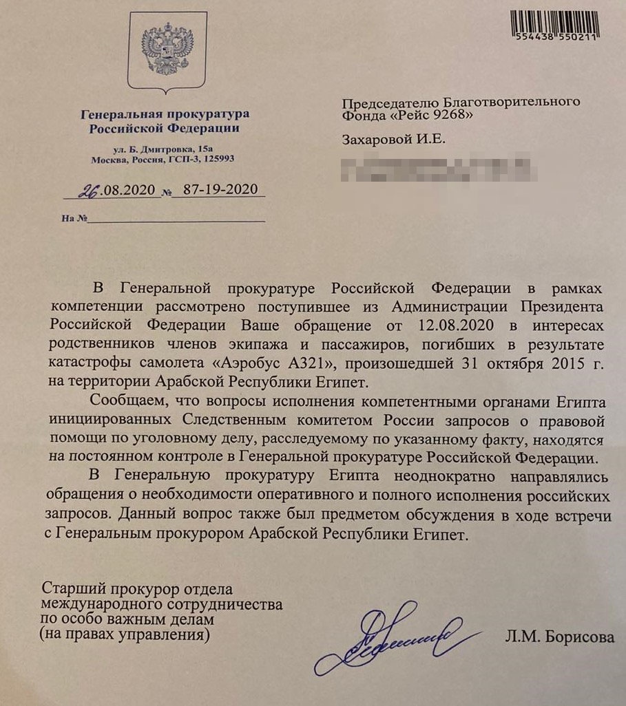 «Запросы о правовой помощи исполнены частично только в 2020 году, информация в них о результатах расследования в Египте не отражена, принимаются исчерпывающие меры на ее получение», — 5-ый год кормят потерпевших отписками. Генпрокуратура России отвечает тем же: «Исполнение запросов Египтом находится на нашем постоянном контроле».