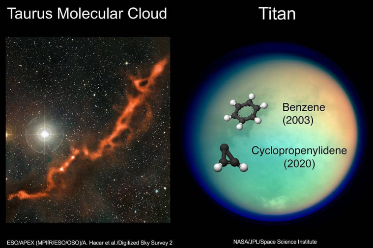 У ученых, изучающих циклопропенилиден (C3H2) на Земле, есть проблема с выделением и поддержанием стабильной формы этой молекулы для исследований. Карбены, такие как C3H2, обладают высокой реакционной способностью, т.е. они стремятся создавать более сложные органические молекулы. Итак, как же были удивлены ученые, изучающие Титан с помощью радиотелескопа ALMA (Atacama Large Millimeter / submillimeter Array) в Чили, когда они смогли идентифицировать небольшие количества C3H2 в верхних слоях атмосферы спутника Сатурна. «Когда я понял, что смотрю на циклопропенилиден, я сначала подумал, ну, я этого не ожидал», - сказал Конор Никсон, планетолог из Центра космических полетов имени Годдарда НАСА в Гринбелте, штат Мэриленд, который руководил радиотелескопом ALMA. Работа его исследовательской группы была опубликована в Astronomical Journal.