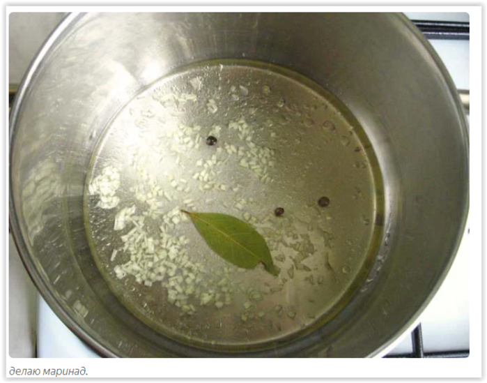 В воду добавляю соль, сахар, растительное масло, уксус 9%, перец душистый горошком, лавровый лист, растительное масло и довожу до кипения.