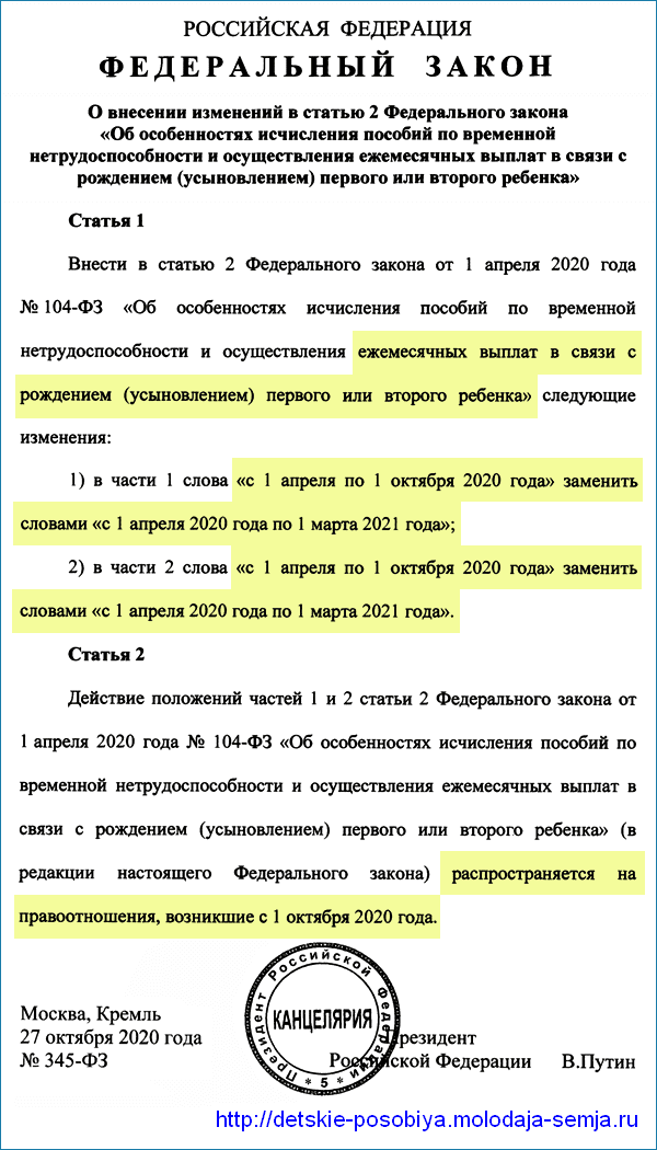 27 октября 2020 года Владимир Путин подписал Федеральный закон № 345-ФЗ, согласно которому период автоматического продления «путинских» пособий на первого и второго ребенка увеличивается до 1 марта 2021 года включительно. Данный закон Государственная Дума в срочном порядке приняла 21 октября, документ уже опубликован на официальном интернет-портале правовой информации. Продолжить получать выплаты без повторного заявления теперь смогут и те семьи, в которых начиная с 01.10.2020 детям исполнилось 1 или 2 года.