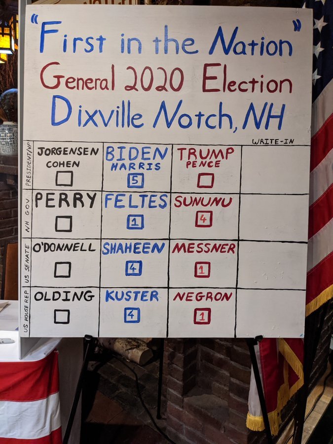 Первый участок на выборах президента США начал работать в поселке Диксвилл-Нотч (штат Нью-Гэмпшир) сразу после полуночи. Все пять местных избирателей проголосовали за Байдена, сообщается в твиттере.