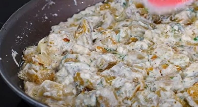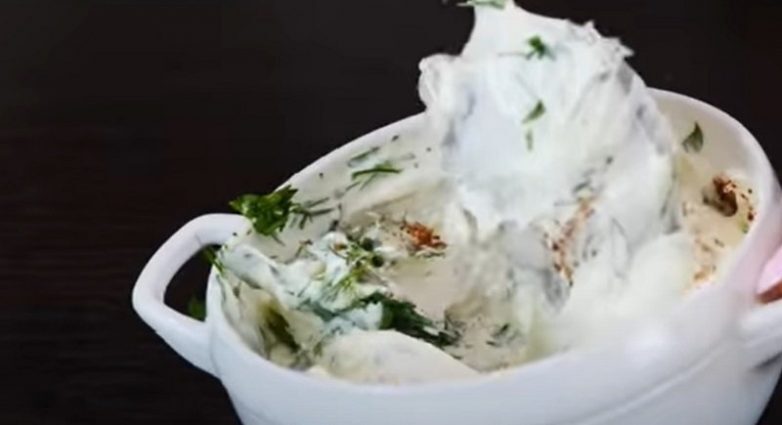 Для заливки смешай сметану с измельченной зеленью. Ольга Матвей советует брать по пару веточек петрушки и укропа. Также добавь пропущенный через пресс чеснок. Посоли и поперчи по вкусу, хорошенько всё перемешай.