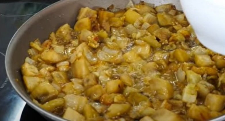 Добавь баклажаны к луку, слегка посоли (приблизительно 1 чайная ложка соли). Перемешай и туши на среднем огне до полной готовности баклажан.
