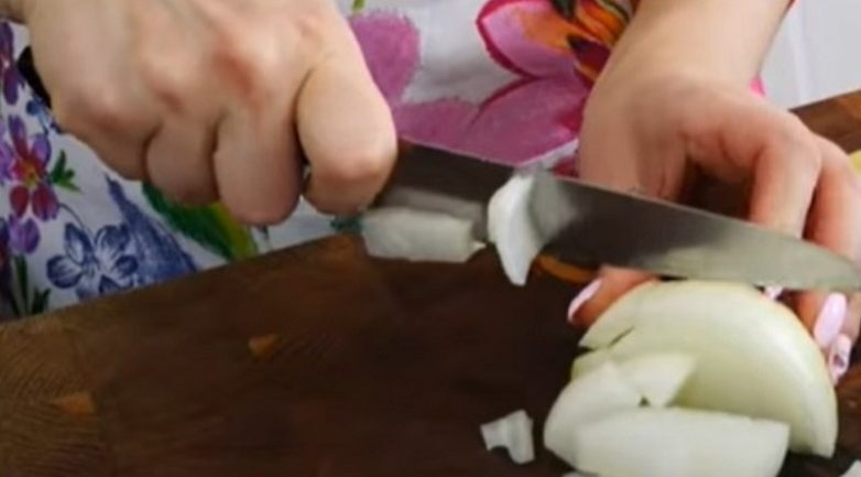 Лук очисти и нарежь крупными кубиками. Переложи лук на хорошо разогретую сковороду с растительным маслом и обжарь до золотистости.