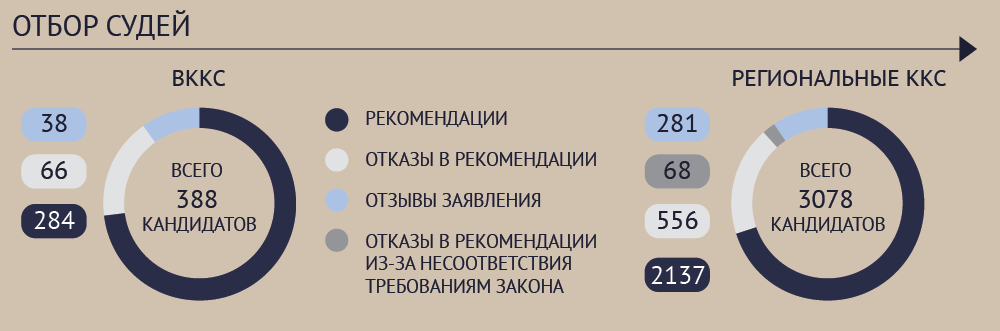 За первые шесть месяцев текущего года ВККС прекратила полномочия 69 судей и председателей судов, 62 из которых сами попросили об отставке. В остальных случаях речь шла об объективных причинах. Например, перевод на другую работу, смерть и упразднение судов. Региональные ККС за этот же период прекратили полномочия 691 судьи и руководителя суда. В подавляющем большинстве случаев (652) это произошло на основании заявления об отставке или по другим уважительным причинам. Но девять судей лишились своих полномочий за дисциплинарные проступки.