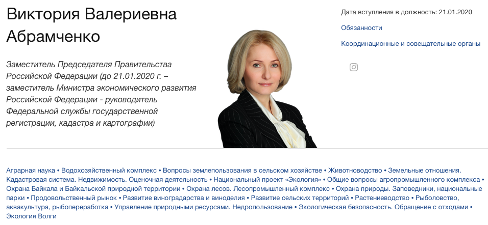 Виктория Валериевна Абрамченко у нас в стране занимается вопросами сельского хозяйства, экологии и оборота недвижимости. Так вот она не выполнила 283 из 298 поручений президента России. Среди всех заместителей Мишустина её KPI самый низкий, так как просрочено 95% поручений президента России.