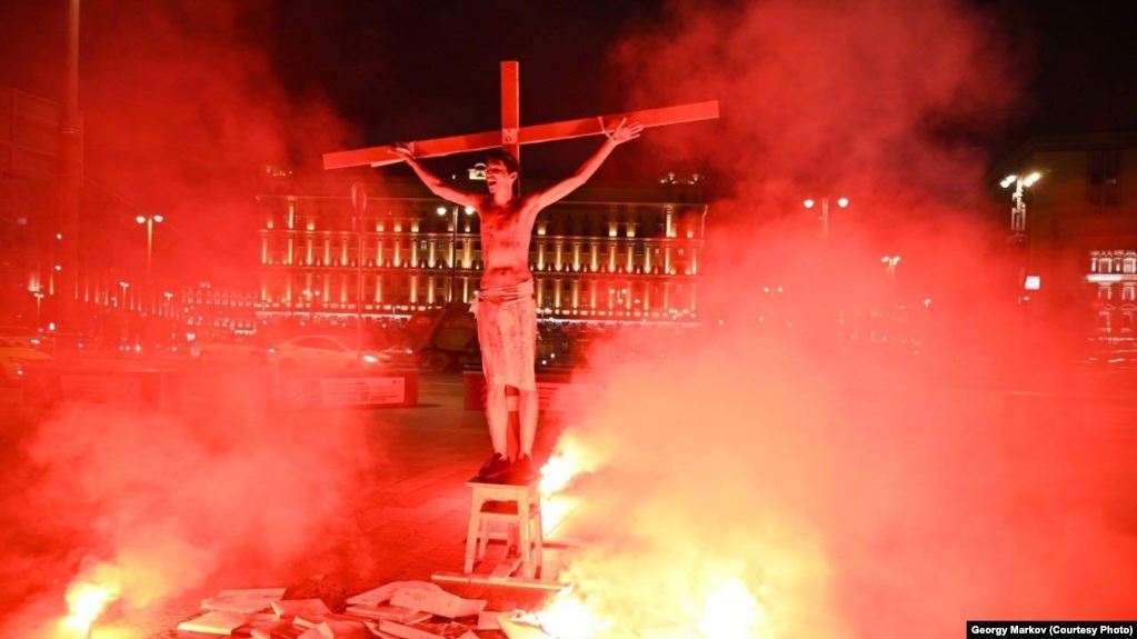 В Москве напротив здания ФСБ на Лубянке активист Павел Крисевич устроил перфоманс в поддержку политзаключенных. Он встал на табурет, привязал свои руки к кресту и имитировал распятие Иисус Христа.