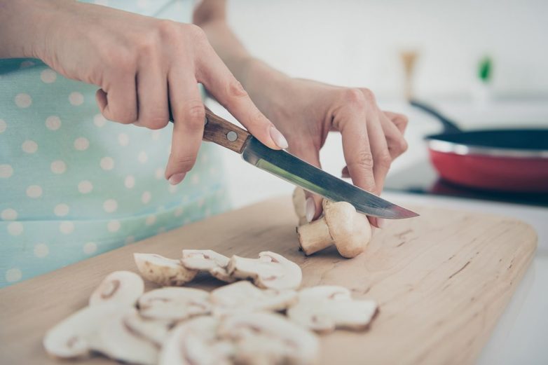 Тщательно моем грибы и просушиваем их с помощью бумажного полотенца. Нарезаем их на дольки и обжариваем на сухой сковороде, пока не испарится весь сок.