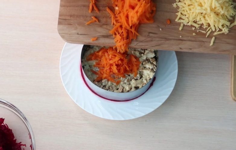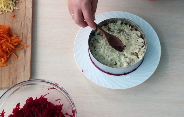 В конце остается лишь собрать салат. Первым слоем выкладываем половину свеклы, затем курицу, а сверху присыпаем всё измельченными орехами. Далее добавляем майонез, морковь и сыр, а затем снова сдабриваем всё майонезом.