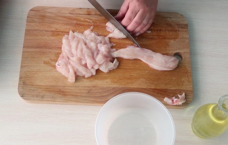 Теперь нарезаем куриное филе небольшими ломтиками и обжариваем на сковороде до золотистости. К слову, не забудь посолить мясо в процессе приготовления.