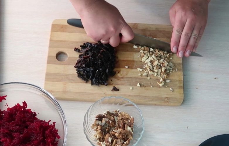 Затем выложи чернослив в небольшую мисочку и залей его кипятком, после чего оставь сухофрукты постоять так в течение 10 минут. По прошествии необходимого времени высуши чернослив с помощью бумажных полотенец, а затем измельчи. Пока чернослив отмокает, нарежь тонкими слайсами чеснок, а также измельчи орехи.