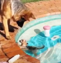 Большой пес помогает маленькому псу выбраться из бассейна