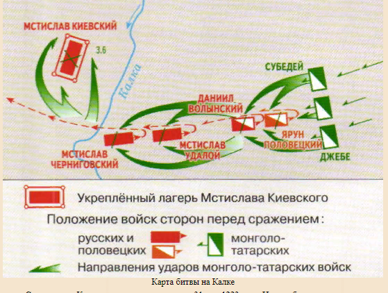 Сражение на Калке началось ранним утром 31 мая 1223 года. Начало битвы не предвещало ничего плохого. Русско-половецкое войско теснило противника, монголы отступали с боями. Однако, в конечном итоге все решили разобщенные действия. Монголы ввели в бой резервы, в результате чего завладели полным преимуществом. Изначально крупного успеха и прорыва обороны, достигло правое крыло конницы Субедея. Монголы разрезали армию противника на 2 части и обратили в бегство левое крыло русского войска, которым командовали Мстислав Удалой и Даниил Романович.