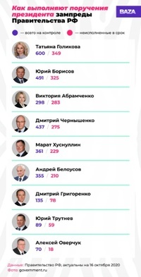 Список министров возглавила Татьяна Голикова, которая выполнила только 251 поручений из 600. На втором месте — Юрий Борисов, проигнорировавший 325 поручений. Замыкает тройку Виктория Абрамченко — она справилась только с 15 поручениями из 298.