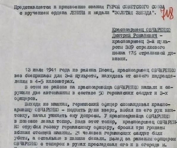 13 июля 1941 года Дмитрий, как обычно, вёз боеприпасы в свою часть, как вдруг увидел перед собой гитлеровский отряд, состоявший из 50 солдат и 3-х офицеров, и передвигавшийся на двух военных грузовиках. Красноармеец и опомниться не успел от неожиданности, как был окружён и взят на прицел. Винтовку у него сразу же отобрали. Один из немецких офицеров решил допросить Дмитрия лично и отвёл его в сторону. Фашисты совершенно успокоились - ведь солдат был один и без оружия, поэтому не представлял для них никакой опасности. Не знали они, что растерянность и шок у Овчаренко уже прошли, уступив место безудержной ярости. Мгновенно схватив топор, лежавший на телеге, он одним могучим ударом снёс офицеру голову с плеч. Всё - таки, он был сыном плотника и прекрасно владел этим грозным инструментом. Пришла теперь очередь немцев оцепенеть от такого жуткого зрелища. Дмитрий, пользуясь их секундным замешательством, успел вытащить из - под сена в телеге 3 гранаты и бросить их в сторону врагов. Более 20 фашистских солдат погибли на месте, остальные в панике бросились врассыпную. Но Овчаренко и не думал останавливаться на достигнутом. Он бросился с топором в погоню за оставшимися в живых вражескими офицерами. Одного он вскоре догнал и тоже отрубил ему голову. Последнему офицеру удалось скрыться. Тогда Овчаренко собрал документы, трофейное оружие и планшеты с картами у убитых, погрузил всё это добро на свою повозку и поехал к своим.