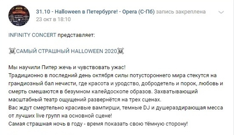 Скриншот страницы одной из развлекательных коммерческих групп в "ВКонтакте". "Мы научили Питер жечь и чувствовать ужас" : сразу вспоминается теракт в петербургском метро всего 3 года назад