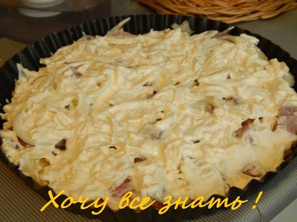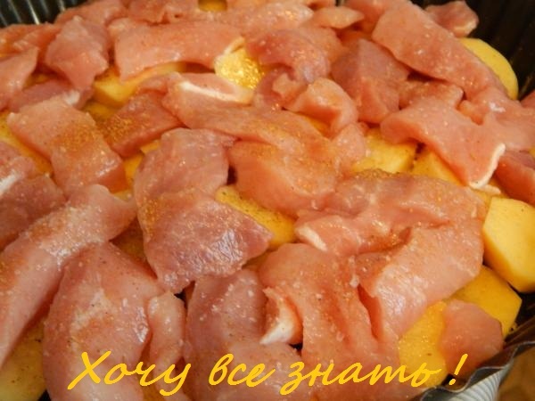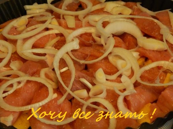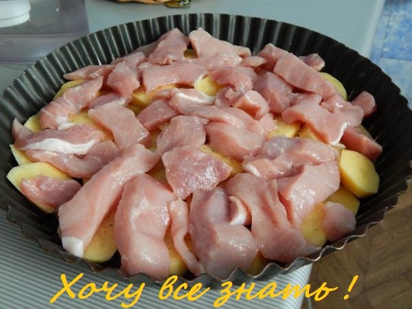 Сверху выкладываем порезанное небольшими кусочками мясо. У меня уже порезанное – для поджарки. Перед тем, как готовить свинину, я обязательно промываю её под проточной водой, что и вам советую делать.