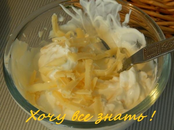 Смешиваем сметану с сыром. Количество сметаны и сыра зависит от ваших предпочтений, мне хватает 4-6 столовых ложек. Кстати, сметану лучше брать не очень жирную.