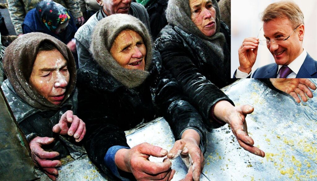 Многоуважаемый Герман Оскарович, вы либо совершенно оторвались от реалий Отечества, либо надышавшись вольным воздухом Международного Валютного Фонда, решили тонко поглумиться над стариками и старухами, бодренько называя их "старшими". Семгу и стейки показывают нашим пенсионерам только по телевизору, когда они уныло пережёвывают гречку или картошечку со своих огородов.