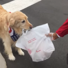 Очаровательный золотистый ретривер помогает нести пакеты