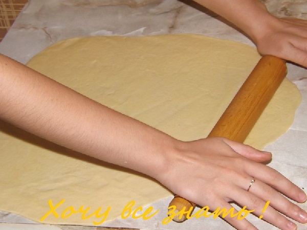Берем одну из частей (остальные два куска ставим обратно в холодильник) и тонко раскатываем ее в блин толщиной 2-3 мм.