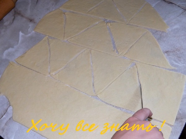 Чертим ножом по тесту продольные полоски шириной 10 см. А теперь опять же ножом рисуем на тесте треугольнички, которые станут нашей заготовкой под рогалики. Чертите основание треугольника 7 см, а две боковые стороны подлиннее – сантиметров по 10-12.