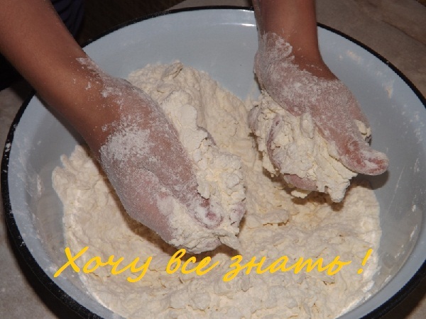 Все ингредиенты хорошо замешиваем руками, чтобы получилось не то что бы крутое тесто, а как на пирожки. Оно должно отлипать от рук, поэтому по необходимости нужно добавлять муку. Готовое тесто отправляем в холодное место или просто в холодильник примерно на 2 часа.