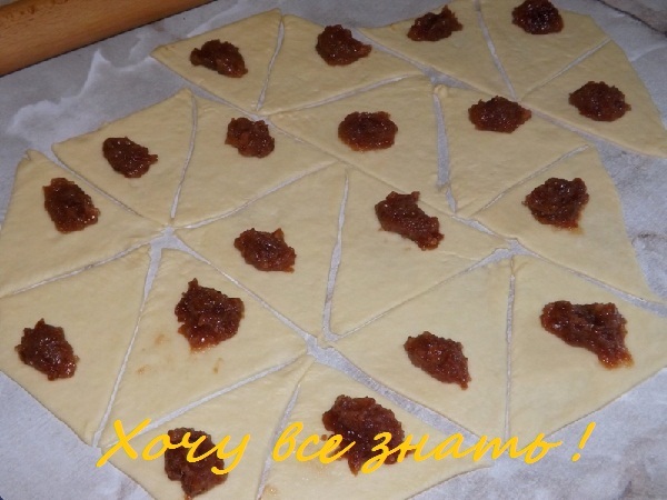 На каждую формочку выкладываем по чайной ложечке повидла. Помещайте начинку ближе к основанию треугольника.