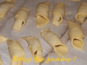 Начиная с основания, заворачиваем «трубочкой» тесто, чтобы получился рогалик. Старайтесь закручивать не сильно свободно, а кончик теста прижмите, чтобы во время выпечки рогалик не раскрутился.
