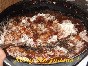 Любимого варенья понадобится где-то половина литровой банки. Его нужно выложить на горячую сковородку и добавить стопочку любого загустителя на выбор (здесь используется манка). Получившуюся смесь нужно подержать на огне, постоянно помешивая, не более 5 минут. Начинка готова, но ее нужно остудить.