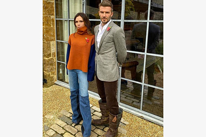 На размещенном снимке 45-летний футболист Дэвид Бэкхем рядом с женой позирует в сером пиджаке, белой рубашке, коричневых джинсах и больших кожаных сапогах с широким голенищем и потертостями. Певица в свою очередь одета в оранжевый свитер с синими рукавами и высоким воротником, а также в прямые джинсы, выполненные в технике пэтчворк.