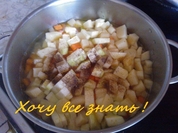 В кипяченую воду высыпаем картофель, а спустя несколько минут добавляем к нему обжаренные овощи, затем посыпаем солью и перцем по вкусу.