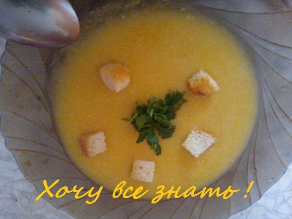 Нужно теперь лишь дождаться пока ваш будущий замечательный суп немного остынет и взбить миксером, чтобы получилась однородная мягкая и нежная масса. Перед тем как подавать на стол ваше лакомство, его нужно снова подогреть сырный суп, доведя его до кипения, после добавить к нему сухарики и украсить зеленью.