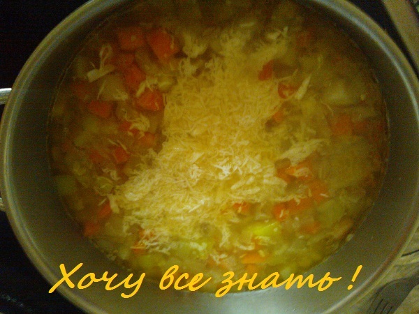 Суп варим пятнадцать минут, затем высыпаем сыр и ждем, пока он полностью растворится.