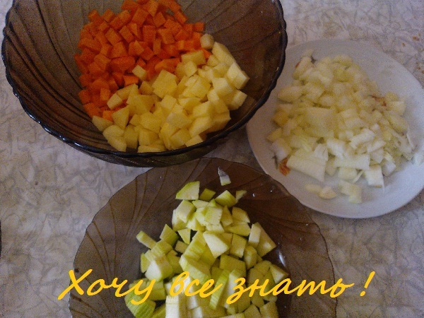 В первую очередь все овощи нужно нарезать аккуратными небольшими кубиками.