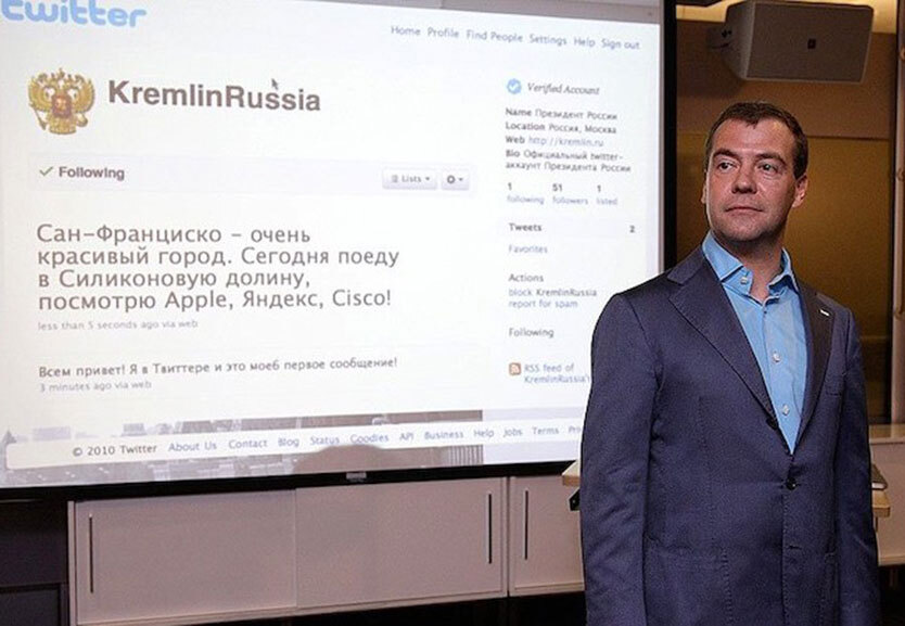 Исторический момент написания и публикации первого твита Дмитрия Медведева, посвящённого Сан-Франциско и Силиконовой долине был запечатлён на видео и вошёл в выпуски новостей как одно из важнейших политических событий в мире: