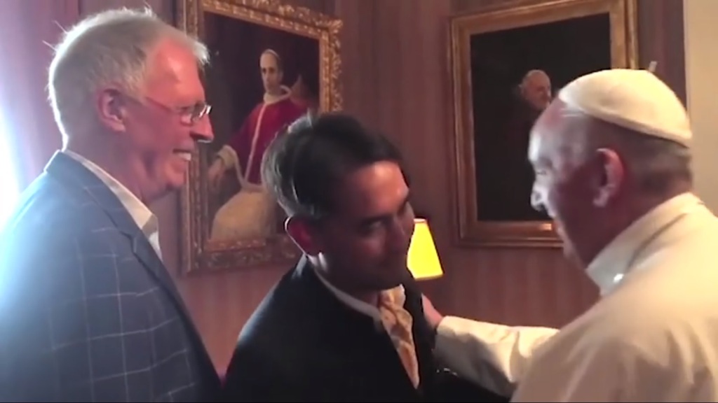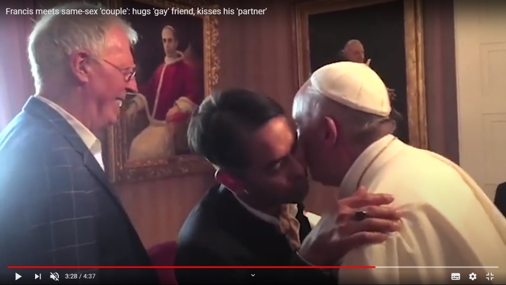 Встреча римского папы Франциска с однополой парой. Как видно из этой и следующих фотографий у нынешнего римского понтифика вполне благожелательный настрой к гомосексуалистам.
