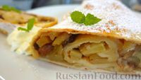 Раскатываем тесто в пласт 2 мм. Поверх посыпаем панировочными сухарями. Приготовленную начинку выкладываем на тесто не доходя 2 см до краев. Заворачиваем в рулет. Смазываем яйцом. Делаем ножом проколы. Выпекать штрудель в разогретой духовке при температуре 180 градусов 35 минут.