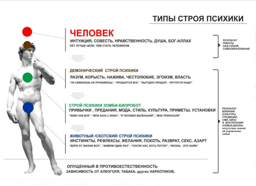 Здесь в графике показано, что определяет состояние человека, это красный цвет. И то что ещё определяет в нём ещё его животное, низменное состояние. Посмотрите как вы себя проявляете в настоящее время в связи с пандемией и в своей жизни вообще, на каком уровне эволюции находится ваше сознание.