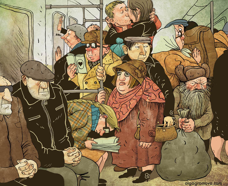 Троллейбус, стоят все прижатые друг к другу настолько плотно, что аж интимно. Стоит высокий парень, к нему частично прижата девушка и бабка - божий одуванчик.