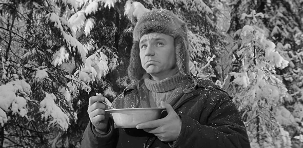 А сцена с Ковригиным, когда он съедает суп, принесенный в лес Тосей - вообще получилась неожиданная. Рыбников облизал алюминиевую ложку и примерз к ней губами.