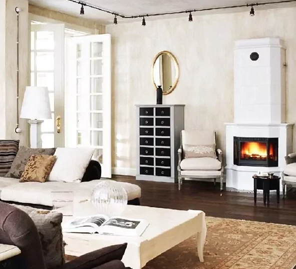 В гостиной особый уют создает биокамин на портале белоснежного цвета. Рядом расположены изящные кресла на ножках.